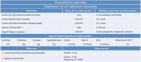 En el caso del grupo de "Leche y derivados", el procedimiento fue diferente: se tomó el calcio como nutriente principal y se clasificó según su aporte calórico en cuatro subgrupos. El proceso se hizo de esta manera debido a que el contenido de grasa, o en algunos casos de azúcar, de los productos lácteos genera una importante variación en las calorías de todo el grupo, razón por la cual no era conveniente dejar este grupo sin subdividir; además, la subdivisión facilita la educación nutricional sobre el consumo de alimentos bajos en grasa y en azúcar.