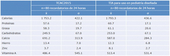 Se incluyeron 241 alimentos, los cuales se distribuyeron en 9 grupos y 4 anexos. Se tuvo en cuenta un nutriente principal para cada grupo y la medida casera se definió según las características de cada alimento. Se observó concordancia en la evaluación de consumo entre las TIA para uso en pediatría y la TCA (CCI>0.81).