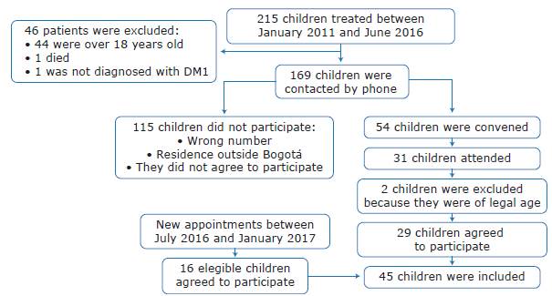 For the inclusion of participants, the parents of children diagnosed with DM 1 were contacted by telephone to invite them to participate in the study. Figure 1 describes the communication and sample collection process.