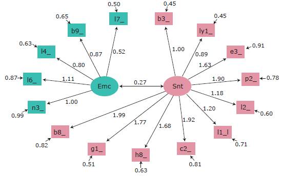 Figure 1: Characteristics of the factor structure of the FACT-Lym scale (system of structural equations). Emc: emotional; Snt: symptoms.