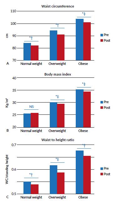 Figure 1 shows a significant decrease among normal weight participants in WC (p=0.039) and WHR (p=0.022), and a significant decrease in WC (p<0.001), BMI (p<0.001) and WHR (p<0.001) in the overweight and obese participants. Multiple comparisons of pre-post program changes between groups according to their baseline nutritional status showed a significant difference (p<0.001) for BMI only. The post-hoc test showed differences between normal weight versus overweight (p=0.001) and between normal weight versus obese (p=0.001) groups.