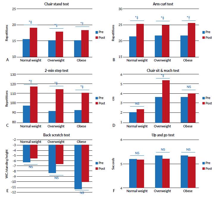 Significant decreases between pre- and post-measurements were found for WC (p<0.001), BMI (p=0.015), and WHR (p<0.001). Improvements were observed in the following tests: chair stand (p<0.001), arm curl (p<0.001), 2-min step (p<0.001), chair sit-&-reach (p=0.018) and back scratch (p=0.014). Regarding BMI, significant changes were observed between normal weight vs. overweight participants (p=0.001) and between normal weight vs. obese participants (p=0.001).