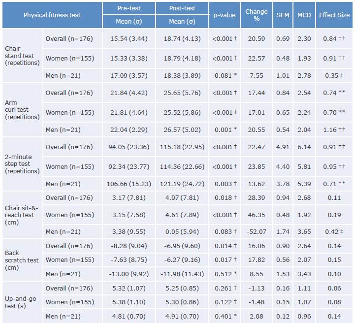 Table 2 shows the pre- and post-program SFT parameters. Significant improvements between the pre-and-post measurements were observed in men, women and overall sample for the chair stand (p<0.001 in women and overall sample; ES=0.35 in men, ES>0.80 in women and overall sample), arm curl (p=0.001 in men, p<0.001 in women and overall sample; ES=1.16 in men, ES<0.80 in women and overall sample), 2-minute step (p=0.003 in men, p<0.001 in women and overall sample; ES=0.71 in men, ES>0.80 in women and over-all sample), chair sit-&-reach (p<0.05 in women and overall sample), and back scratch (p<0.05 in women and overall sample) tests. No significant changes in the timed up-and-go test were observed. In addition, the arm curl and the 2-minute step tests showed a higher change than the MDC in men, women and the overall sample. The chair stand test showed a higher change than the MDC in women and overall sample, while the chair sit-&-reach test showed a decrease in men with higher change than the MDC.