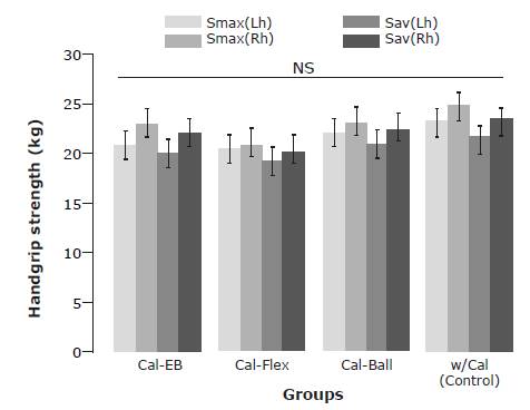 Figure 1: Maximal handgrip strength of dominant and non-dominant hands in obese sedentary women after no warm-up, stretching warm-up, strength warm-up, and squeezing-ball warm-up. Lh: left hand; Rh: right hand; Cal-EB: strength warm-up; Cal-Flex: stretching warm-up; Cal-Ball: squeezing-ball warm-up; w/Cal: no warm-up.