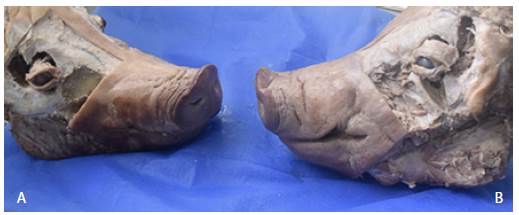 Figure 1:: Dissection performed on pig heads. A: pig's head with resection of the maxillary bone; B: pig's head with complete maxillary bone.