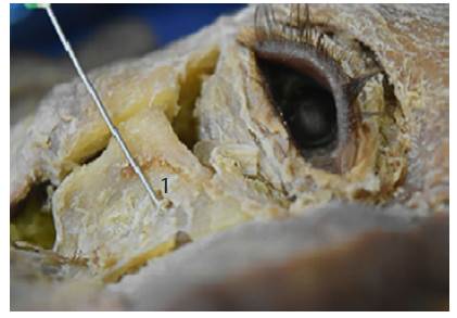 By dissecting the human corpse, it was possible to observe the frontal belly of the occipitofrontal muscle and the orbital and palpebral portions of the orbicularis oculi muscle, as well as the infraorbital artery, the infraorbital vein, and the infraorbital nerve (Figure 2).