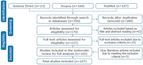 A total of 350 studies were retrieved after the initial search was carried out (ScienceDirect 23, Scopus 160, and PubMed 167). Once duplicates (n=180) were removed, 43 publications were excluded for full-text reading since, based on the reading of titles and abstracts, it was decided they did not meet the established inclusion criteria and did not provide useful information for the objective of the review. Out of the 127 studies selected for full-text reading, 25 were excluded based on the established exclusion criteria. Finally, 102 articles were included forfull analysis. In addition, 5 studies that were published in journals that were not indexed in the databases but met the inclusion criteria were also included. It should be noted that these 5 gray literature studies were retrieved from Google Scholar. The studies screening and selection process is shown in Figure 1.