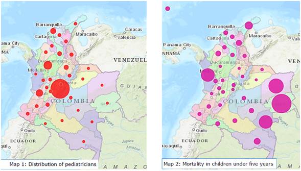 The pertinence of pediatricians was understood as the relationship between the number and distribution of pediatricians and some health indicators considered to be affected by the quality and access opportunity to health care. The basic child health indicators reported by the Comprehensive Social Protection Information System (SISPRO, Spanish acronym for Sistema Integral de Información de la Protección Social) as of 2016 by department (the latest data available in the system at the time the study was conducted) were used to analyze said pertinence. Health indicators with the greatest impact on children were selected in accordance with the methodological guidelines on the Standard System of Basic Health Indicators in Colombia, issued by the Ministry of Health and Social Protection:21 child mortality rate (children under 5 years of age), mortality rate due to acute respiratory infection (ARI) in children under 5 years of age, and mortality caused by and associated with malnutrition (MNT) in children younger than 5 years. These situations are directly related to both, the access opportunity to health care and the quality of health care, given that most deaths of Colombian children are caused by preventable and treatable complications and diseases.21