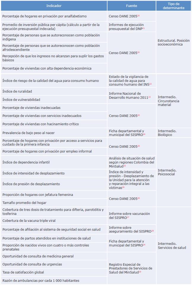 Los investigadores diseñaron tres modelos de regresión beta30,31 para las siguientes categorías: 1) determinantes estructurales, en el que solo se incluyeron indicadores de posición socioeconómica ya que, a pesar de presumir una situación heterogénea en el campo político, no se encontraron variables que dieran información de este tipo con medición municipal; 2) determinantes intermedios de condiciones de vida y trabajo, factores de tipo comportamental y biológico, y factores psicosociales, y 3) determinantes intermedios del sistema de salud colombiano.