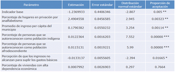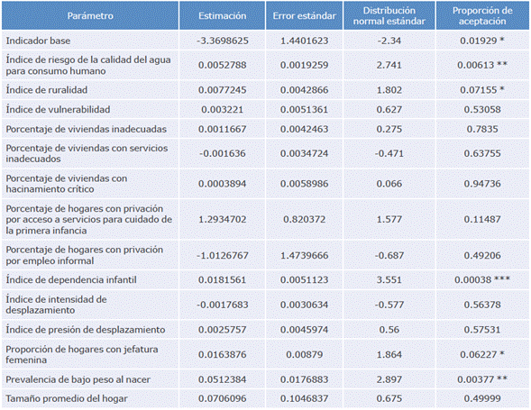 Entre las variables que resultaron significativas para estos determinantes, es decir que su variación produjo un cambio en las tasas de Mía nivel municipal, se encuentran las siguientes: porcentaje de población afrodescendiente, porcentaje de hogares con privación por analfabetismo, porcentaje de hogares que percibían que sus ingresos no alcanzaban para suplir los gastos básicos y promedio de ingresos per cápita percibidos por el municipio.