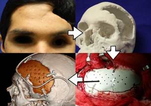 En la Figura 2 se observa la secuencia pre y transoperatoria de un paciente con defecto craneal, en quien utilizando un modelo impreso en 3D fue posible planificar el procedimiento correctivo y se obtuvieron excelentes resultados.