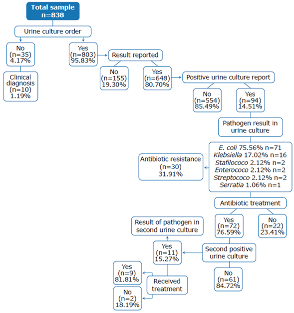 The medical records of 838 pregnant women enrolled in ANC programs at 21 primary care centers of Bucaramanga affiliated with ESE-ISABU were reviewed. The median age of participants was 22 years (IQR=19-27), and the median years of schooling was 9 years (IQR=6-11). 32.29% of pregnant women had a paid occupation. Only 803 pregnant women (95.82%) had at least one urine culture requested during their ANC appointment and the result was recorded in the medical record of 648 (77.32%) of them. Similarly, of the total number of pregnant women analyzed (n = 838), 20 (2.38%) had a history of UTI and 145 (17.30%) were diagnosed with vaginosis during pregnancy (Table 2).
