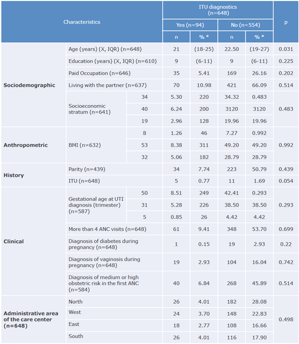 Secondary analysis of the data obtained in a main study conducted on 838 pregnant women treated by the public healthcare network of Bucaramanga. The prevalence of UTI was estimated considering the number of pregnant women with a urine culture report (n=648). A descriptive analysis of the sample characteristics and a bivariate analysis were performed to evaluate the differences in the diagnosis of UTI. Finally, factors associated with UTI were estimated using a binomial logistic regression model.
