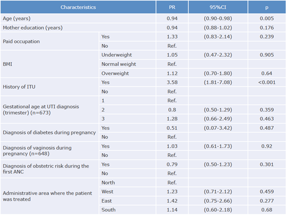 Independent variables also included pre-pregnancy body mass index (BMI), categorized as underweight, normal weight, and overweight according to the World Health Organization cut-off points;20 parity (yes/no); history of UTI (yes/no); gestational age at diagnosis of UTI (trimester); number of ANC visits attended (1-4 and >4); diagnosis of diabetes (yes/no) or vaginosis (yes/no) during pregnancy; and diagnosis of medium or high obstetric risk during the first ANC visit (yes/no), based on the information reported in the medical history by the physician and recorded in the administrative care area to which the health center belonged (north, west, east and south) and where each patient was treated.