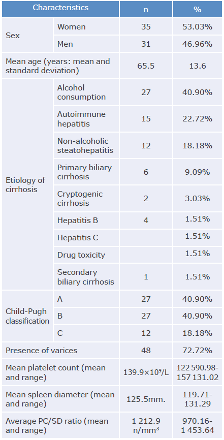 Of the 66 patients included in the study, 35 (53.03%) were women. The average age of the participants was 65.5 years (range: 32-87 years and standard deviation: 13.6 years). The main causes of cirrhosis were chronic alcohol consumption (40.90%), autoimmune hepatitis (22.72%) and non-alcoholic steatohepatitis (NASH) (18.18%).