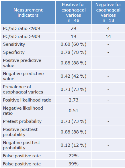 A prospective diagnostic test accuracy study was conducted in 66 patients with cirrhosis treated at the Hospital Universitario de La Samaritana between July and December 2018. A descriptive analysis of the data was performed. In addition, the diagnostic performance of the PC/SD ratio (cut-off point <909) for the detection of EV was compared with the findings reported in the esophagogastroduodenoscopy (gold standard), calculating its sensitivity, specificity, positive predictive value (PPV), negative predictive value (NPV), positive likelihood ratio (LR+), and negative likelihood ratio (LR-). A significance level of p<0.05 was considered.