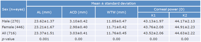 Mean AL in men was 23.62±1.37mm and in women, 23.21±1.67mm. Mean values for ACD and WTW were also higher in men (3.10±0.42mm vs. 2.98±0.40mm and 11.85±0.47mm vs. 11.71±0.42mm respectively), although the most curved KMs were found in women (Table 1).