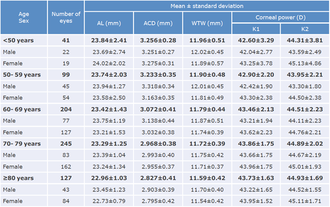 The median age of the participants was 70 years (IQR: 71.70-76.90) and most of the eyes were female (62.3%). Regarding ocular biometric parameters, the median AL, K1, K2, ACD and WTW were 23.37±1.51mm, 43.52±2.06, 44.63±2.22, 3.03±0.41mm and 11.76±0.45mm, respectively.