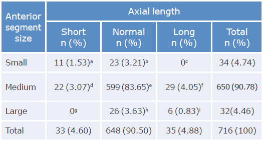 When adding the eyes with normal AL and mean ACD, it was found that 599 (83.65%) were between P5 and P95 and classified as normal, and that the remaining 117 (16.34%) were outside the normal range. These results were combined to classify the eyes according to clinical conditions suggested by Holladay (Table 3).18