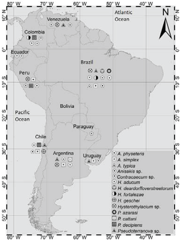 Figure 2: Geographical distribution of anisakid nematodes reported in fish for human consumption in South America.