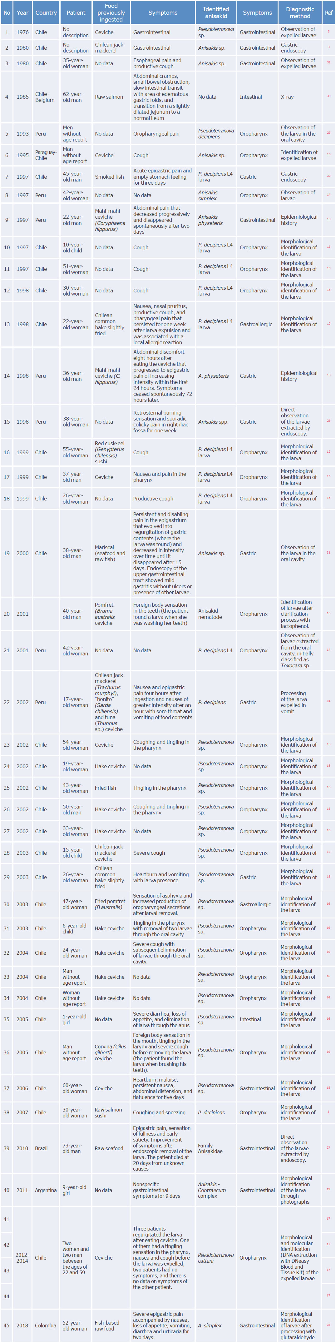 In Europe and Asia, anisakidosis is considered a public health issue due to the large number of cases reported with gastric, allergic and gastroallergic symptoms; however, in South America, it is still a little-known disease. Table 2 presents a summary of clinical cases associated with anisakid parasites in South America published between 1976 and 2018.