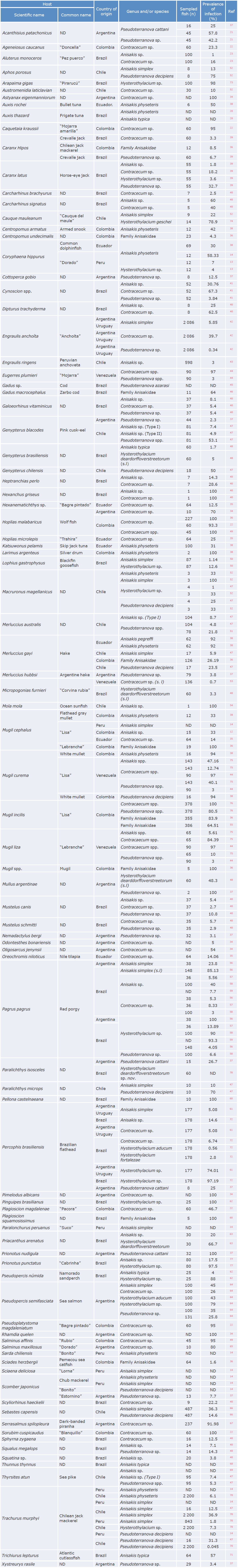 Anisakid nematodes are parasites present in marine mammals and fish species for human consumption. For example, in South America, fish parasitized by these species have been identified in Argentina, Brazil, Chile, Colombia, Ecuador, Peru and Venezuela. Table 3 lists the fish species identified as hosts of parasites of the family Anisakidae in the region.