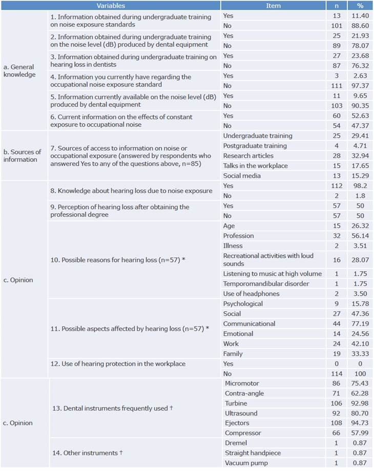 The data were obtained through a virtual survey designed for this purpose, which was reviewed and validated by hearing professionals and a methodologist. The instrument was composed of 22 questions on socio-demographic and occupational information, perception and level of knowledge of hearing loss caused by exposure to loud noises as a result of the use of dental equipment, and level of knowledge of national regulations regarding occupational noise exposure (Annex 1).