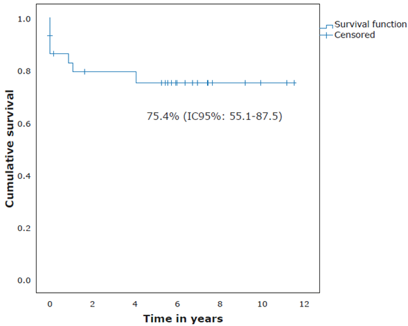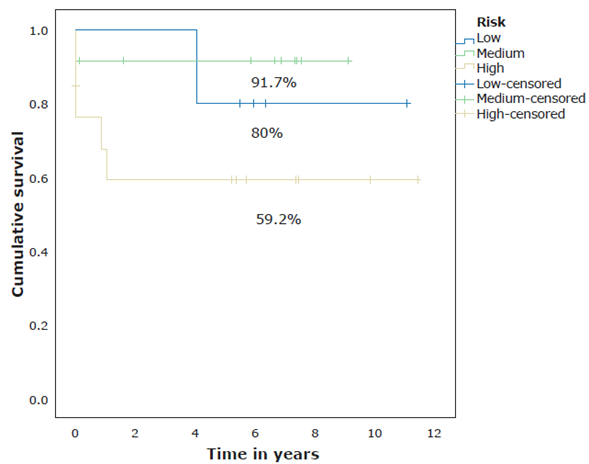 Concerning risk classification, 13 (43%) participants were classified as high risk, 12 (40%) as medium risk, and 5 (17%) as low risk. The 11-year OS, according to risk, was 59.2%, 91.7% and 80% for high-, medium- and low-risk patients, respectively (Figure 3). OS for all participants was 75.4% (95%CI: 55.1-87.5) (Figure 4), while EFS was 64.3% (95%CI: 40-80.5) with a median follow-up time of 6.35 years (0-11.43 years) (Figure 5).