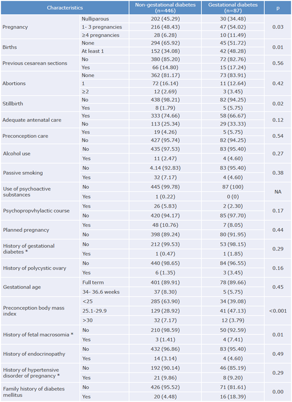 When analyzing baseline -social, biological, and psychological- variables, which could be factors associated with the development or not of GD, it was found that age, marital status, type of health system affiliation, race, gravidity, having had at least one delivery previously, history of stillbirth and fetal macrosomia, preconception BMI, and family history of diabetes mellitus were statistically significant (Tables 1 and 2).