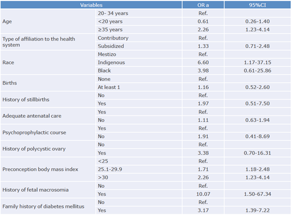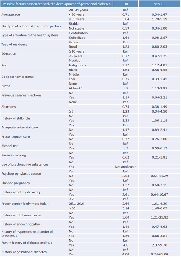 The prevalence of GD was 16.32% (95%CI:13.28-19.73). The following risk factors associated with GD were identified: age >35 (OR=2.26; 95%CI:1.23-4.14), indigenous race (OR=6.60; 95%CI:1.17-37.15), BMI >25 (OR=2. 26; 95%CI:1.23-4.14), history of fetal macrosomia (OR=10.07; 95%CI: 1.50-67.34), and family history of diabetes mellitus (OR=3.17; 95%CI:1.39-7.22). Regarding maternal-perinatal outcomes, a significant association was found with labor induction (OR=4.41; 95%CI:1.71-11.39), emergency cesarean section (OR=2.22; 95%CI:1.33-3.73), elective cesarean section (OR=2.79; 95%CI:1.51-5.18), fetal weight >90th percentile (OR=2.78; 95%CI:1.29-5.98), and neonatal hospitalization (OR=8.1; 95%CI:4.48-18.62).