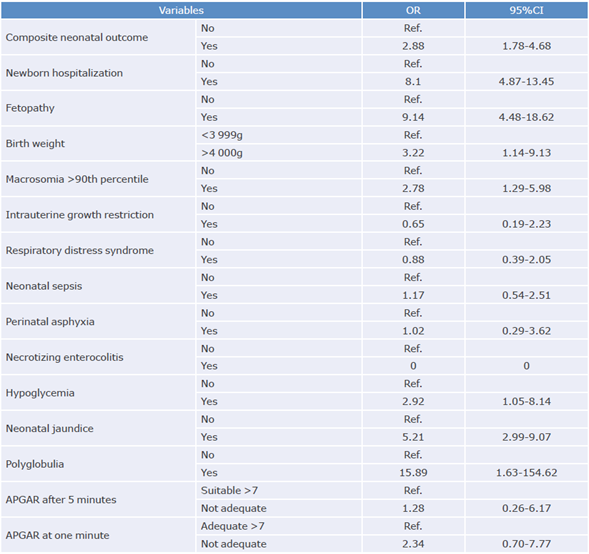 The factors (high preconception BMI, age older than 35 years, indigenous race, history of macrosomia, and family history of diabetes) and maternal-perinatal outcomes (induction of labor, termination of pregnancy by cesarean section, birth weight >4 000g, macrosomia >90th percentile, increased risk of developing at least one neonatal disorder, fetopathy and requiring neonatal hospitalization), in which a significant association with GD was observed, are similar to those reported in most of the literature consulted.