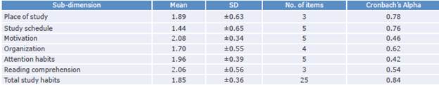Concerning students' study habits, it was found that those in the motivation subdimension had the best scores, while those in the study schedule sub-dimension had the worst (Table 1).