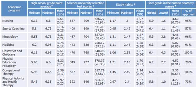 At the international level, Schutte19 conducted a study with 5 133 Anatomy students between 2004 and 2010 at a university in the USA and demonstrated that higher education admission scores were associated with academic achievement in this course.
