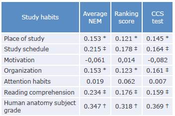 However, other authors such as Montes-Iturrizaga23 report that study habits may not be linked to mastery of an area of knowledge. The postulates of this author are in accordance with the results of the present research, since it was observed here that no study habit sub-dimension was significant when tested as a factor associated with academic performance in human anatomy; this could be related to the characteristics of the course, as it has a wide range of content linked to scientific-biological knowledge that must be addressed by the students.
