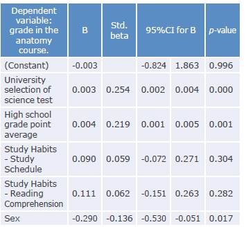 The model was statistically significant (p<0.001), with an adjusted R 2 of 0.199, i.e., it explained 19.9% of the variance of the dependent variable (final grade of the human anatomy course). The variables Science PSU scores, NEM average, and sex were significantly associated with the final grade of the course (p=0.000, p=0.001, and p=0.017, respectively); however, the association with variables related to study habits (study schedules and reading comprehension) was not statistically significant.
