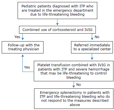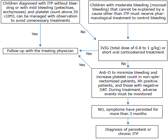Providing treatment to patients with ITP is challenging for clinicians due to the multiple strategies available to control hemorrhagic manifestations and recover platelet count.8 Such strategies include observation (watch-and-wait), specific pharmacological management with intravenous immunoglobulins, corticosteroids, thrombopoietin receptor agonists (TPO-RAs), and even splenectomy.1,2,8-10 Although this condition was described more than a hundred years ago,11 a wide arrange of concepts, definitions, diagnostic and therapeutic approaches are evident in clinical practice.12 Thus, the objective of this paper is to develop an evidence-based clinical practice guideline (CPG) to standardize the definition of ITP and, thus, reduce the variability of its diagnosis and provide evidence-based indications for the treatment of acute, persistent and chronic ITP in patients under 18 years of age.
