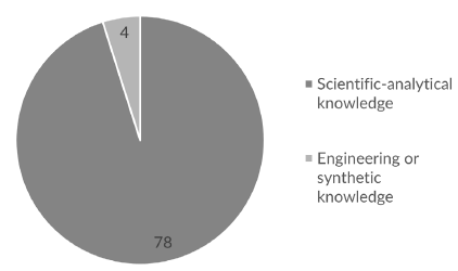 Only representatives from 232 of the 714 officially recognized medical and health science research groups in Colombia responded to the initial survey, and of these, only 82 (35.34%) participated in research networks (Figure 1). Most researchers in these 82 groups were engaged in Applied Research (64.63%), followed by Applied Research plus Basic Research (19.51%), and Basic Research (15.85%) (Figure 2). For its part, the type of knowledge in most of these groups (95.12%) was analytical scientific and came from areas where scientific knowledge based on cognitive and rational processes abounds or from formal models (codified, rational, and verifiable knowledge). In the other groups (4.87%), knowledge was synthetic (applied or problem-related knowledge) or related to engineering36,37 (Figure 3).