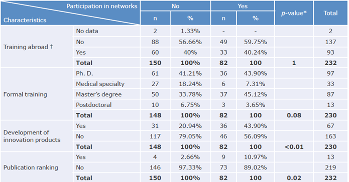 Significant differences were observed between researchers involved in networking and those who were not regarding the development of innovation products (p<0.01) and appearance in publication rankings (p=0.02) (Table 1).