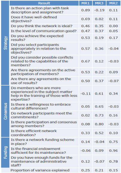 These three essential factors identified for the proper functioning of the network were called by the R statistical software according to the relationship with the grouping of results with the following concepts: MR1: "Strategy," MR3: "Consensus" and MR2: "Funding", thus summarizing the essence of the factors most associated with each of them (Table 2).