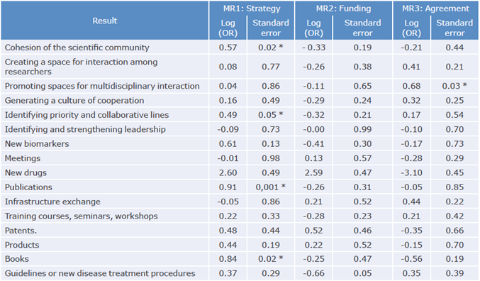 The results of the factor analysis were combined with the responses on the actual results of network participation from the first survey, and it was found that "cohesion of the scientific community", "identifying priority and collaborative lines", "publications" and "books" were significantly associated with the factor "strategy" (Table 3).