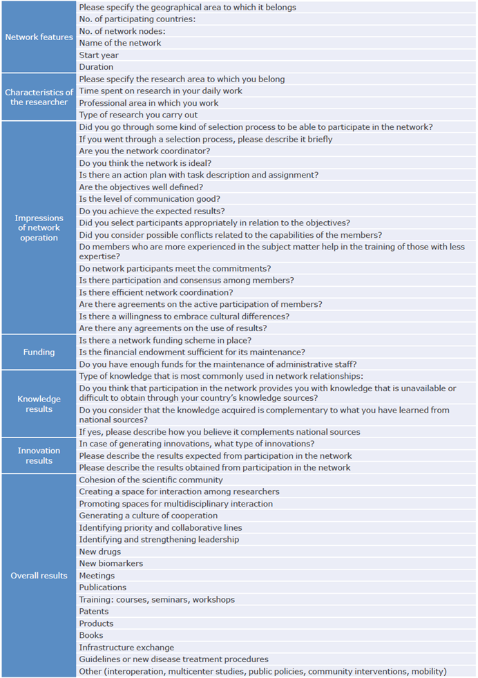 The survey submitted during the first phase evaluated 7 thematic sections (network characteristics, researchers' characteristics, impressions on network operation, funding, knowledge results, innovation results and overall results) through 54 questions: 6 on the description of the network, 4 on the description of its scope, 20 on its operation, and 24 on the results. This survey data was complemented with public academic and research data on the scholars, and it was integrated with information from the ranking of researchers from Colombian institutions.32