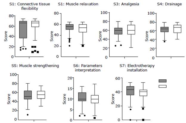 A pilot, non-experimental, cross-sectional study was conducted in 114 physical therapy students enrolled during the first semester of 2019 in a physical agents course offered at the Universidad Andres Bello, Santiago, Chile. The OSCE consisted of 7 peer-validated stations, in which various skills were implemented in simulated clinical scenarios to achieve learning outcomes associated with the use of physical agents, namely: S1: connective tissue flexibility; S2: muscle relaxation; S3: analgesia; S4: drainage; S5: muscle strengthening; S6: parameter interpretation; and S7: equipment installation. Observers at each station assessed students' clinical skills and decision-making using a checklist. OSCE scores were described using medians and interquartile ranges, representing the data dispersion between the 25th and 75th percentile (P25-P75). Station scores by sex were compared using the Mann-Whitney U test.