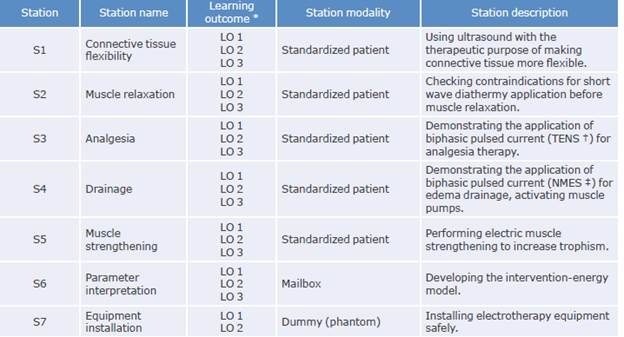 The OSCE was designed by physical agents professors in accordance with the institutional educational model, which establishes that training should be based on LOs. The LOs described in the course program included: 1) the ability to analyze physical and physiological results derived from the application of non-ionizing physical agents; 2) the evaluation of different non-ionizing physical agents modalities in terms of the therapeutic objective in different professional contexts and the resolution of deficiencies and problems with the functioning of the users due to various health conditions; and 3) the evaluation of deficiencies and functioning problems originated by the users' health conditions, as well as the relevance and context of intervention with non-ionizing physical agents.