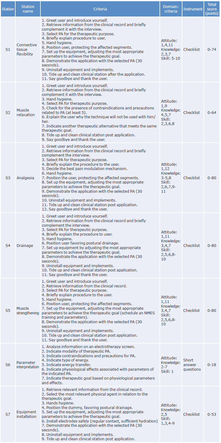 Stations S1, S2, S3, S4 and S5 had standardized patients (previously trained and assigned with hea conditions), while a dummy was used in S7; station S6 (mailbox) involved the interpretation of electrotherapy equipment parameters. Each station was evaluated with a checklist that included criteria in attitudes, knowledge, and skills domains (Table 2).9-12,15