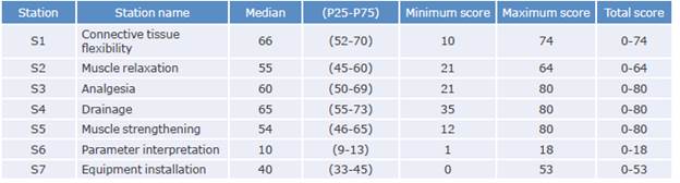 Stations with higher scores were connective tissue flexibility and drainage scenarios, where the score for the 25th percentile (P25) is equal to or greater than the minimum passing score. On the other hand, the lowest performance stations were the parameter interpretation station and the muscle strengthening station, where scores for the P25 and the P50 were below the passing score, which is consistent with the percentage of students who passed at these stations (Table 3).