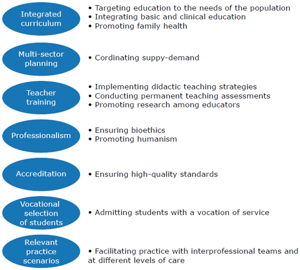 Similarly, as Larsen states,67 changes are required in medical curricula that integrate basic and clinical sciences, while also considering psychosocial and ethical aspects, health promotion, disease prevention and community development. Similarly, when implementing these changes, it is critical to ensure multisector collaboration and planning, i.e., there must be coordination between the education sector and local, regional and national authorities,68 in order to achieve harmonization between medical education, research, services and needs of the population.69