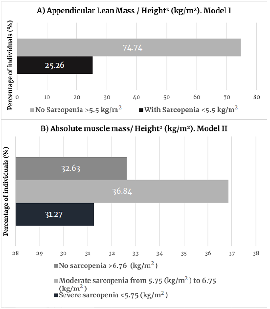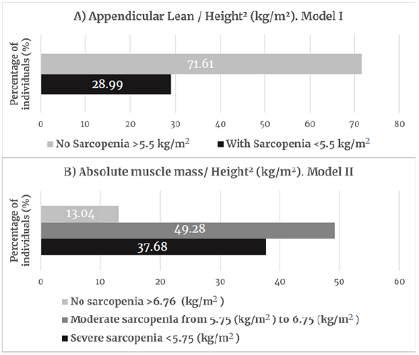 Second, information on total mass (kg), fat mass (kg), fat percentage, total lean mass (kg), upper and lower limb lean mass (kg), and total bone mass (kg) was obtained; to this end, dual X-ray absorptiometry (DXA)23 was used with a Hologic Discovery Wi analyzer and the software APEXTM version 4.5.3. In order to classify the level of sarcopenia, appendicular lean mass (appendicular lean mass/heigth2 (kg/m2)) with two cut-off points was considered, as well as absolute mass (absolute muscle mass/heigth2 (kg/m2)) with three cut-off points.23