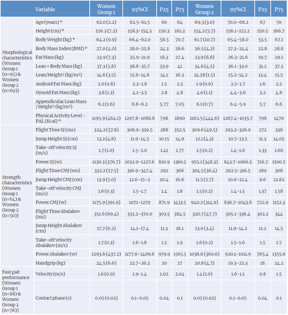 Moreover, the handgrip strength test, the gait speed test, or other functional tests should be interpreted with caution because values and indicators are variable (e.g., force indicators vs. speed indicators) and the individual may be misclassified. In this sense, the specificity of the tests and protocols applied for diagnostic purposes in the proposed algorithms, tests and indicators15,16 should be strengthened to avoid overestimating or underestimating both sarcopenia (low muscle quantity and quality) and sarcopenia associated with functionality (manifestations of low muscle strength, poor intramuscular and intermuscular coordination, low transfer to simple and complex movements). With all this in mind, the objective of this study was to analyze sarcopenia markers and their relation to the strength and gait in physically active older women between 55-76 years old.
