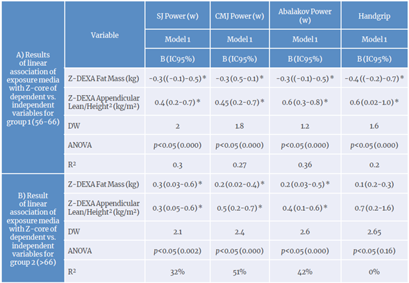 Multiple regression model forG1 (56-66years): the ANOVA for the regression model indicated that independent variables significantly improved power prediction for all jumps (SJ: f=11.818, p=0.001. r2=0.56; CMJ: f=9361, p=0.001, r*=0.51; CMJAS: F=14.556, r2=0.60, p=0.001) but not HS (F=10.313 p=0.009. R2=0.20). This showed that fat negatively alters the manifestation of power and HS, while appendicular lean mass favors the expression of powerfor all jumps (Table 3A) .