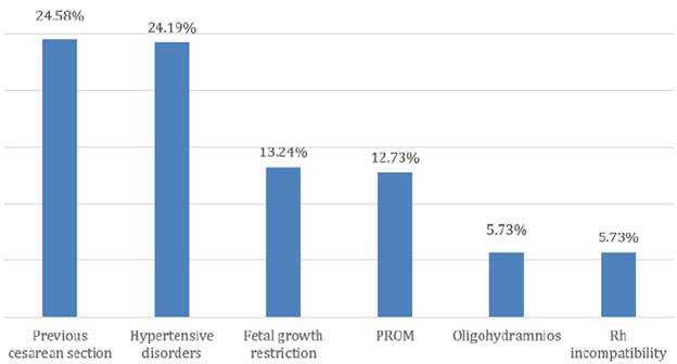 It was also found that the study population required care due to fetal growth restriction (intrauterine growth restriction and small fetus for gestational age) in 13.24% of cases and premature rupture of membranes (PROM) in 12.73%. 4.31% had perinatal infection: 0.38% with human immunodeficiency virus, 0.5% with syphilis, 2.42% with toxoplasmosis; and 1.01% with vector-borne infections.